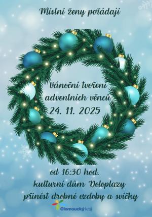 Místní ženy pořádají v pondělí 24.11. od 16.30 v kulturním domě tvoření adventních věnců. Přineste si drobné ozdoby a svíčky.