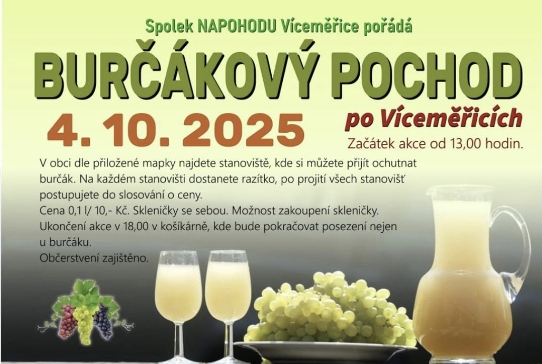 Spolek NAPOHODU Víceměřice pořádá 4.10.2025 Burčákový pochod. Začátek akce ve 13 hod. Více informací v příloze.