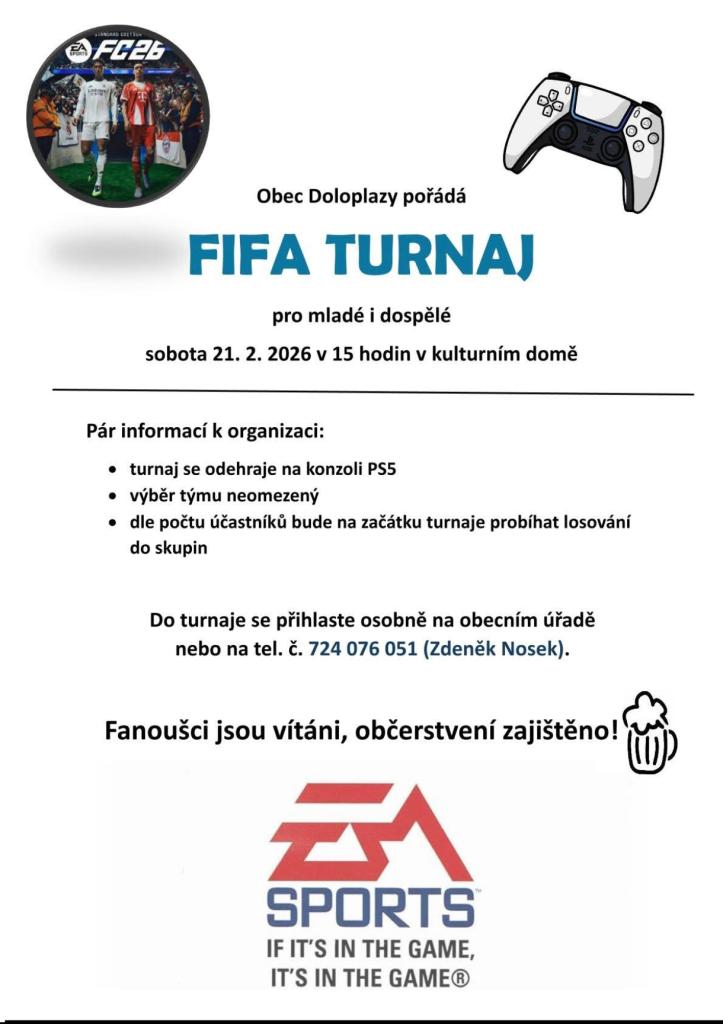 Obec Doloplazy pořádá v sobotu 21.2.2026 v 15 hod. V kulturním domě FIFA TURNAJ pro mladé a dospělé, hrát se bude na konzoli PS5.