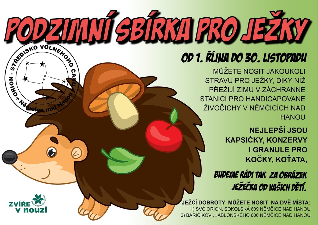 Do 30.11. můžete podpořit ježky v záchranné stanici v Němčicích nad Hanou. Více informací v příloze.