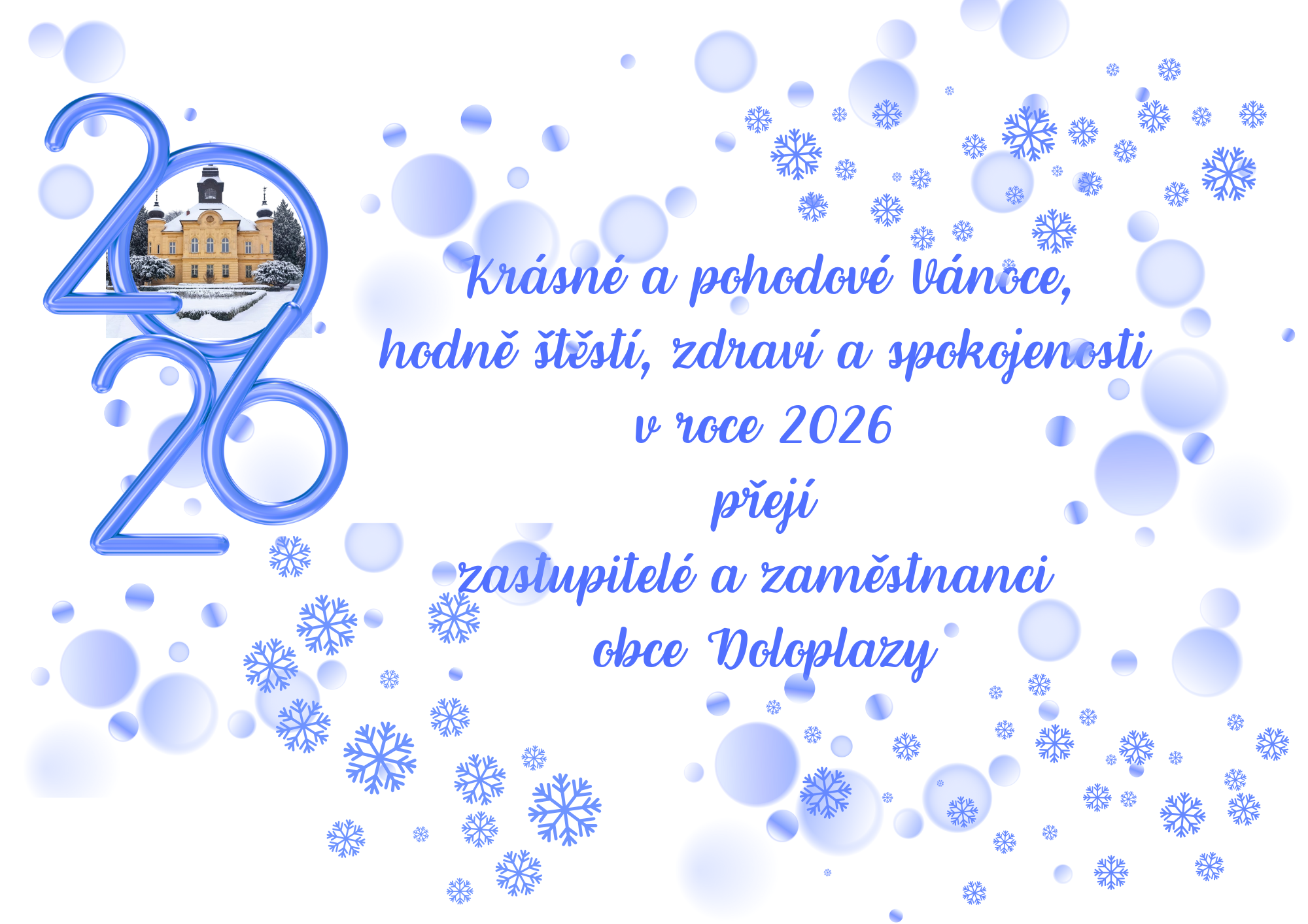 Krásné a pohodové Vánoce, hodně štěstí, zdraví a spokojenosti v roce 2026 přejí zastupitelé a zaměstnanci obce Doloplazy.