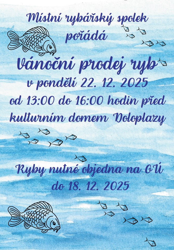 Rybářský spolek pořádá v pondělí 22.12. od 13 do 16 hod. před kulturním domem prodej vánočních ryb. Ryby je nutné objednat na obecním úřadě.